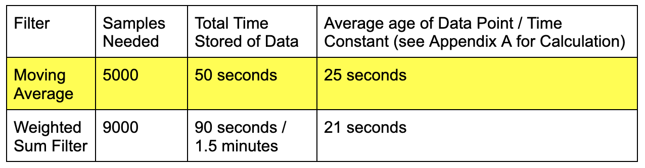 A moving average filter was first created to determine a baseline “smoothness” that was acceptable, and then a weighted design filter was created to match that same smoothness. The advantage of the weighted filter was that the average age of the data wa a lot smaller when using the same number of samples. However, after modelling, it turned out that for the weighted sum filter’s smoothing effect to match the moving average filter, a lot more samples have to be used, as shown in the following table: