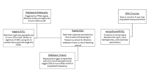 The image below summarizes the general flow of STROBE operation. The microcontroller on the STROBE board wirelessly receives a signal from the broadcast controller, then sends signals to the DAC to turn on/off the LED at the requested frequency and power. The rest of the circuit ensures the current is controlled and precise.