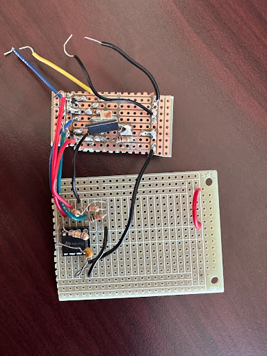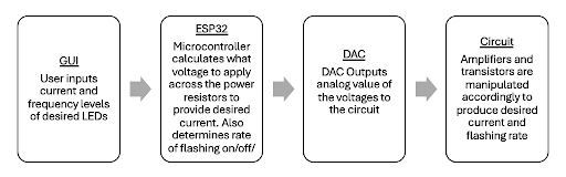 Multiple circuits were designed, and the one that performed best under prototype used a DAC in order to allow us to control the voltage through the circuit with a digital signal from a microcontroller. The DAC output is sent to an amplifier, and the amplifier acts like a control system and ensures that the voltage across the resistor (which directly corresponds to the current through the LED) matches the DAC output.