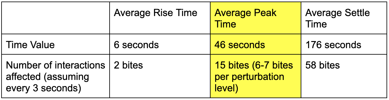 Next, we needed to determine how long it took for fruit fly behaviour to react to optogenetic experiments. This was done by looking at the rate at which they bite - the bites/second, and in the below image we can see that the step response has a similar shape to a 2nd order step response. Thus, we were able to measure rise/peak/settle time to see how long it took for the fruit flies to react.